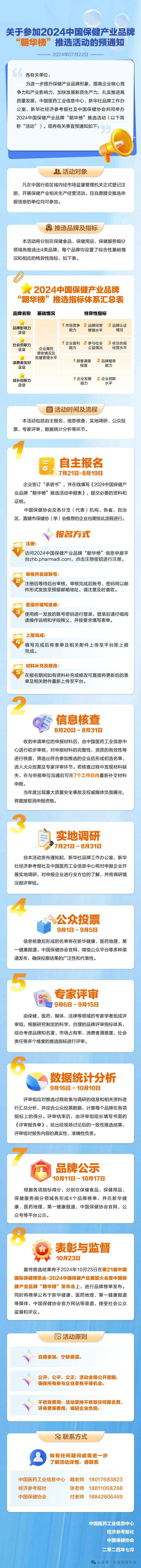 《通知》介绍,为进一步提升保健产业品牌形象,提高企业核心竞争力和产业影响力,加快发展新质生产力,扎实推进高质量发展,中国医药工业信息中心、新华社品牌工作办公室、新华社经济参考报社及中国保健协会共同举办2024中国保健产业品牌“朝华榜”推选活动。