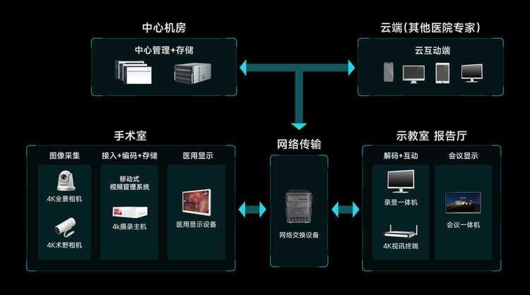 海康慧影数字化手术室系列产品基于局域网、互联网、5G网络,并通过分布式部署架构、网络化部署方式、多接口兼容来适配不同手术室场景需求,提升诊疗及医教水平。