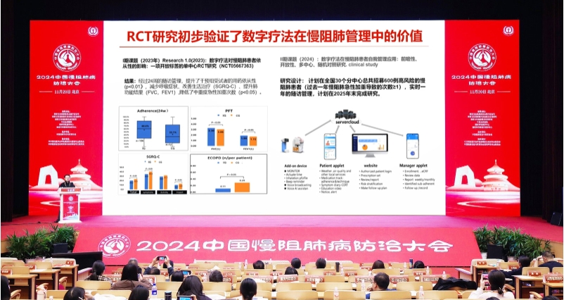 国家呼吸医学中心、中日友好医院牛宏涛博士在报告厅做了题为《数字疗法在慢阻肺病照护中的临床应用》的学术汇报,近些年随着新技术的不断涌现,针对吸入疗法过程中患者“吸气能力不足、吸入技术不佳、治疗不依从、治疗效果不佳”等诸多痛点,数字疗法技术已经具备解决能力,他介绍,Ⅰ期RCT课题“数字疗法对慢阻肺病患者依从性的影响”研究,经过24周的随访管理,提升了干预组受试者的用药依从性(p<0.01),减少呼吸症状、改善生活治疗(SGRQ-C)、提升肺功能结果(FVC,FEV1),降低了中重度急性加重次数(p<0.05),验证了数字疗法在慢阻肺病管理中的价值。