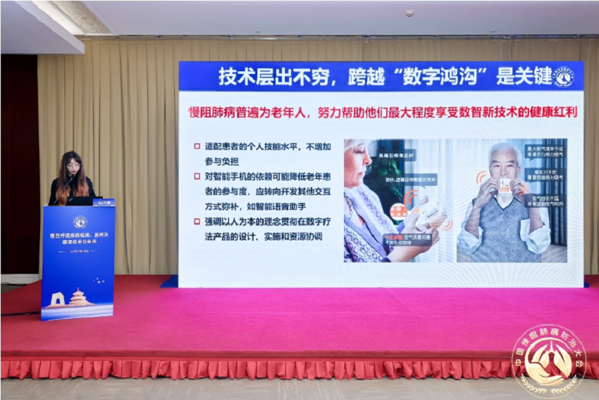 在慢性呼吸疾病检测、监测及康复技术分会场,国家呼吸医学中心、中日友好医院乌汗娜博士分享了《数智化技术在慢阻肺病照护中的应用》,她全面介绍了由国家呼吸医学中心、中日友好医院研发的“呼吸慢病数字疗法”的应用实践,介绍了数字疗法技术在慢阻肺病患者实际照护场景的应用价值。