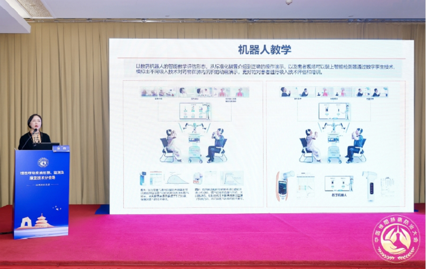 新质生产力技术支持单位代表张丹女士在分享《以呼吸和共病为核心的智能监测技术应用》中提到,数字疗法技术已在全国200余家一线医院开展临床应用,形成了“吸入治疗管理+智能机器人教药+AI远程随访干预管理”的模式,从标准化装置介绍到正确的操作演示,患者现场可以装上智能检测器通过数字孪生技术,模拟出不同吸入技术对药物在肺内沉积的动画演示,更好的对患者进行吸入技术评估和培训。