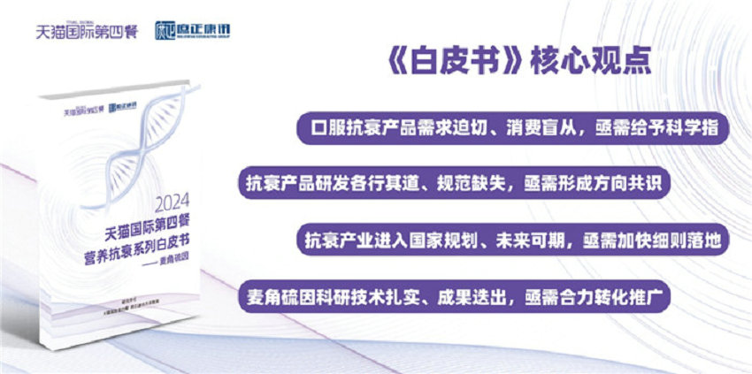 面对全球人口老龄化的挑战,营养抗衰成为健康领域的一大热点。随着科学研究的深入和生物技术的突破,营养抗衰成分和产品不断涌现。为了促进营养抗衰市场的稳健发展,保护消费者权益和投资人安全,11月21日,“2024天猫国际医药保健行业生态合作大会”上,天猫国际第四餐与庶正康讯联合发布了《营养抗衰白皮书——麦角硫因》。(下称《白皮书》)。