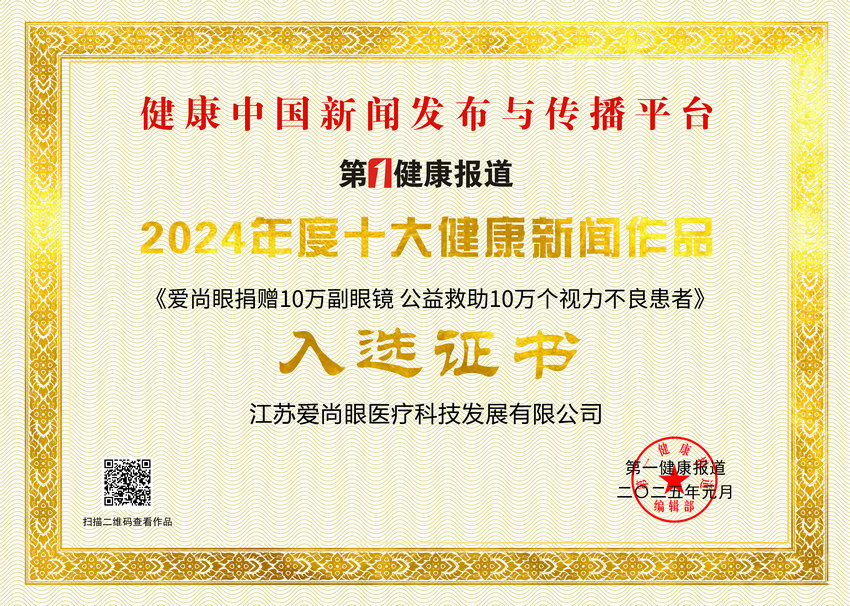 近日,《爱尚眼捐赠10万副眼镜 公益救助10万个视力不良患者》作品入选第一健康报道2024年度十大健康新闻(以下简称“十大健康新闻”)。