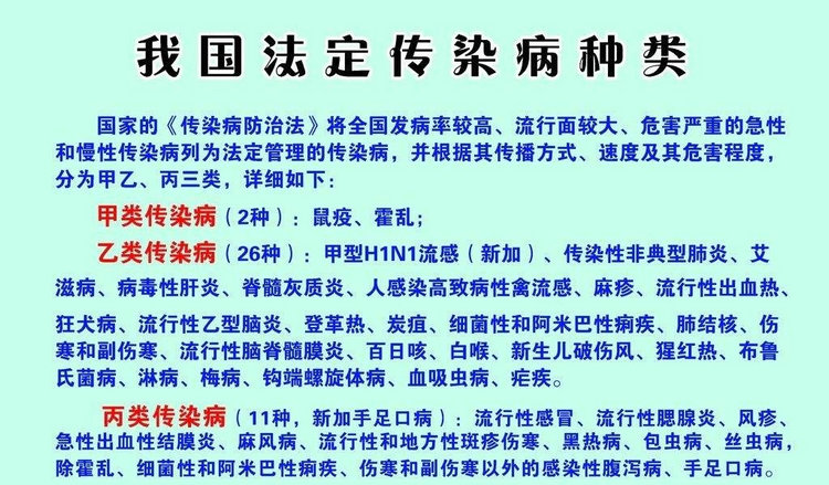 当前,我国法定传染病共有40种,其中甲类2种,乙类27种,丙类11种。甲类传染病包括鼠疫、霍乱。乙类传染病包括新型冠状病毒肺炎、传染性非典型肺炎、艾滋病等。其中新型冠状病毒肺炎、传染性非典型肺炎和炭疽中的肺炭疽,采取甲类传染病的预防控制措施。丙类传染病为监测管理传染病,包括流行性感冒等。