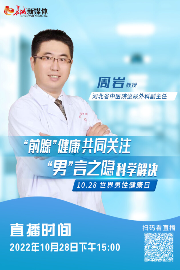 每年的10月28日是“世界男性健康日”,重在呼吁社会家庭对男性健康的关注与关爱。然而,在中国人的刻板印象中,男科疾病一直都是难登“大雅之堂”,这样的意识极大地阻碍了前列腺等知识的科普,导致众多男性对男科疾病没有足够的了解,因此错过了最佳的就诊与治疗时间。10月28日上午10:00-11:00,长城新媒体特邀河北省中医院泌尿外科主任周岩教授做客直播间,在线为广大网友科普前列腺疾病的相关知识,期待您的观看!