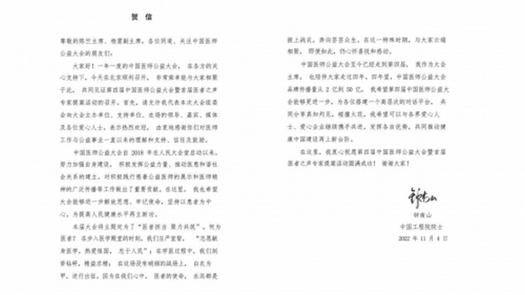 钟南山院士向中国医师公益大会致来贺信,表示,希望可以与各界爱心人士、爱心企业继续携手共进,发挥各自优势,共同推动健康中国建设再上新台阶。