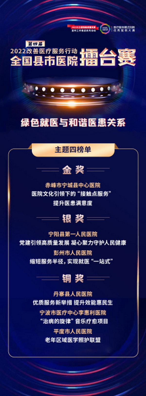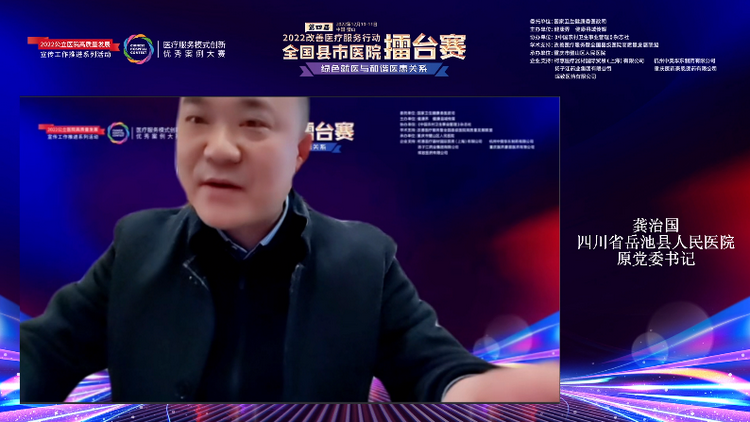 12月11日,在二十余万人的瞩目下,由国家卫健委医政司指导,健康界、健康县域传媒主办,重庆市璧山区人民医院承办“绿色就医与和谐医患关系”主题决赛,经过近两个小时的激烈角逐,终于尘埃落定,赤峰市宁城县中心医院选送的案例获得金奖;宁阳县第一人民医院、彭州市人民医院选送的案例分别获得银奖;宁波市医疗中心李惠利医院、丹寨县人民医院、平度市人民医院分别获得了铜奖。