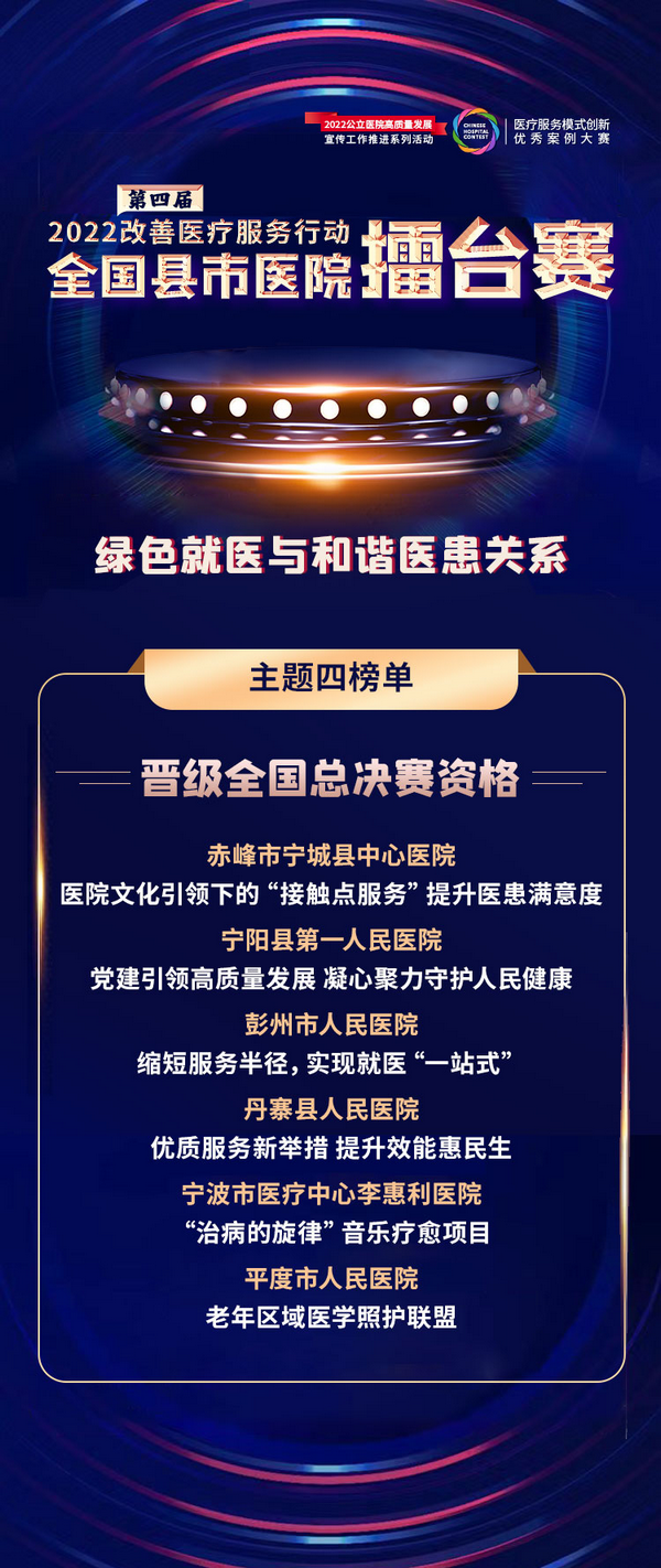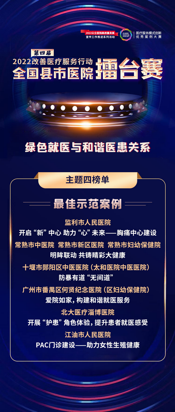 “绿色就医与和谐医患关系”主题比赛的晋级全国总决赛资格、最佳示范案例名单如下: