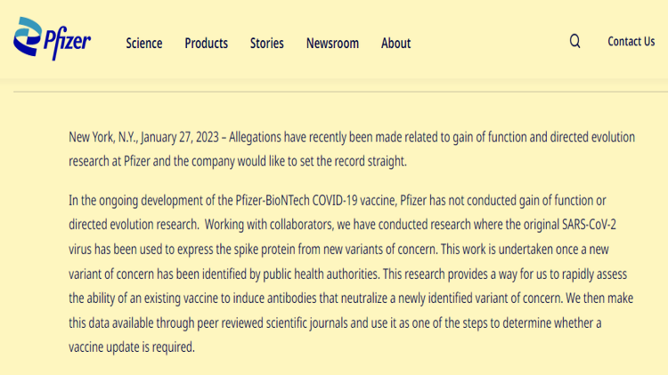 图片▲辉瑞官网发布声明,声称“没有进行‘功能增益’或‘定向进化’研究”