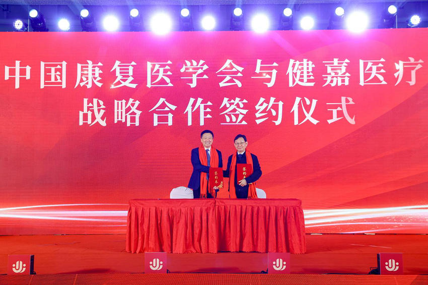 随后进行的战略合作签约仪式上,健嘉医疗与中国康复医学会签署战略合作协议。