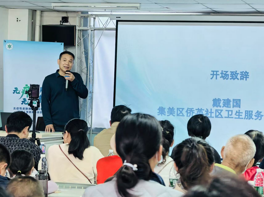 活动中,侨英街道社区卫生服务中心戴建国主任首先开场致词,厦门弘爱医院的刘晓坤教授介绍了炎症性皮肤病的基础知识,厦门大学附属第一医院蔡良奇教授、厦门市第三医院刘厚广教授以炎症性皮肤病的代表“特应性皮炎”为例,分别讲解了治疗药物全解析及如何应对疾病的治疗内容,将艰涩难懂的学科前沿转化成通俗易懂的生活语言,为参会者科普了炎症性皮肤病的相关治疗和护理知识。