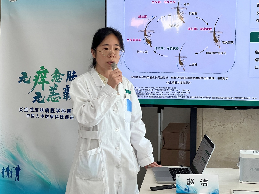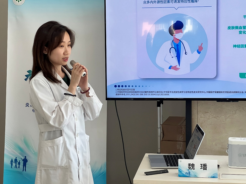 活动开始,中国中医科学院广安门医院徐晨琛教授首先开场致词,随后徐晨琛教授介绍了如何让特应性皮炎长期治疗的基础知识,魏璠医师、赵洁医师以炎症性皮肤病的代表“特应性皮炎”为例,分别讲解了面对瘙痒难忍的特应性皮炎如何快速止痒及认识斑秃和斑秃的科学治疗等内容,将艰涩难懂的学科前沿转化成通俗易懂的生活语言,为参会者科普了炎症性皮肤病的相关治疗和护理知识。