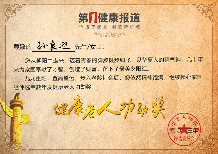 10月22日,2023年九九重阳节即将来临之际,中国文明健康推广者孙良迎喜获第二届“健康老人功勋奖”荣誉称号。