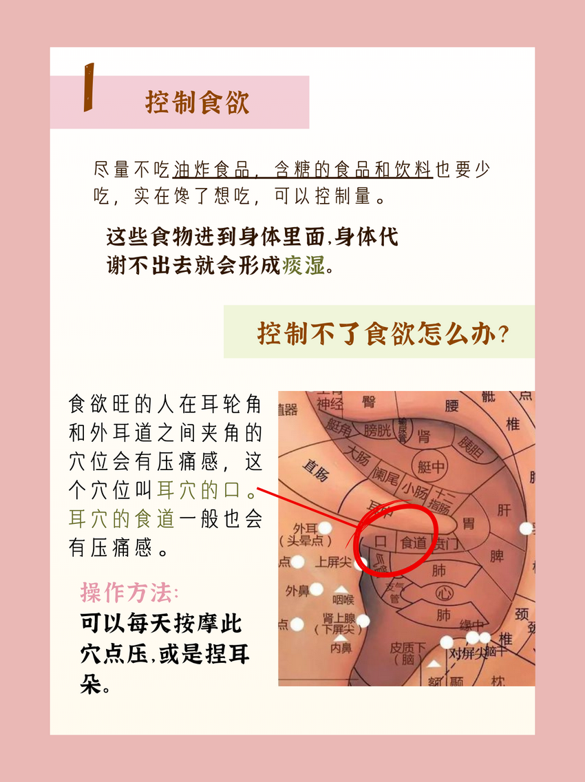 控制不了食欲,可以按按这个穴位。食欲旺的人在耳轮角和外耳道之间夹角的穴位会有压痛感,这个穴位叫耳穴的口,耳穴的食道一般也会有压痛。可以每天按摩此穴点压,或是捏耳朵。