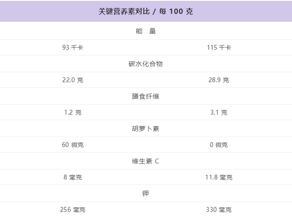 两者在维生素 C 和钾含量上相当。维生素 C 含量两者并不高,但钾含量都不低,每 100 克能提供膳食参考摄入量的 10% 以上。但这里还是要划下重点,香蕉并不是最佳的补钾选择,毕竟热量太高,对于高钾饮食需求的人来说并不友好。
