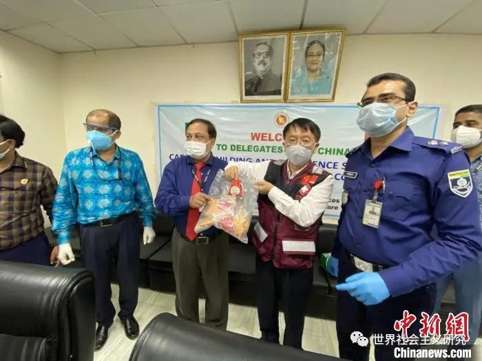 中新网海口2020年7月6日电 ,中国政府赴孟加拉国抗疫医疗专家组日前圆满完成任务顺利抵琼。此图为专家组中医专家张汉洪谈古论今、引经据典,纵论中医药在各型新冠肺炎患者的应用效果,畅谈中孟传统医学一脉相承,并赠予海南省中医院自制的中药香囊。
