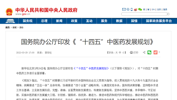 《“十四五”中医药发展规划》已经国务院同意,现印发给你们,请认真贯彻执行。