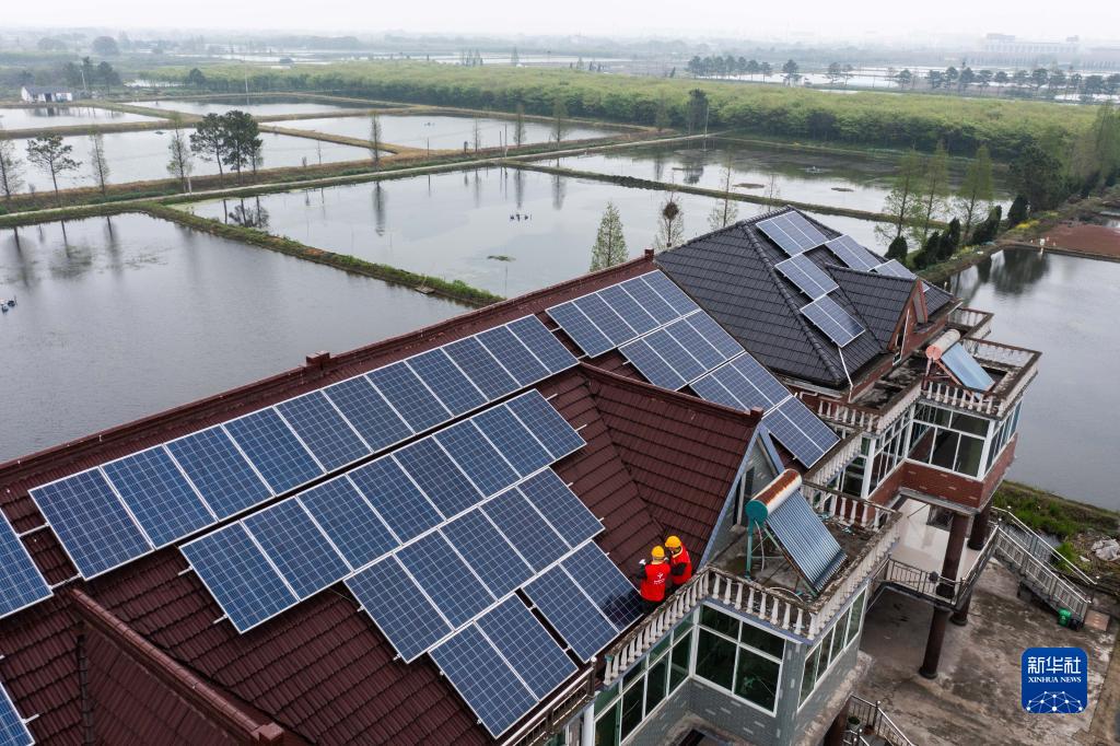 在浙江省湖州市德清县乾元镇齐星村,工作人员为当地村民的太阳能屋顶光伏电站巡检(无人机照片,2022年3月31日摄)。新华社记者 徐昱 摄