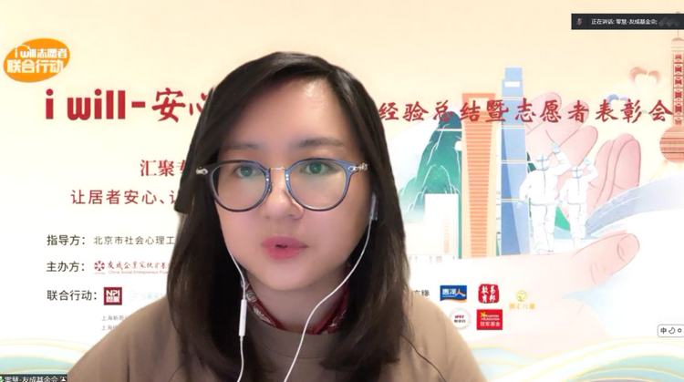 随后,i will安心行动主办方、资助方、友成基金会秘书长零慧对本次行动的发起缘由、目的、过程做了详细的说明。她指出本次行动的初心是“让居者安心、让社区安定、让信心安住”,i will本质上就是一个志愿服务共同体,采用创新性的手段,利用互联网技术进行线上的跨界联合,为志愿者制定相对系统化的解决方案以促进联合志愿行动的开展;最后,她号召更多的志愿者加入这种创新性的志愿行动,以面对愈加庞大的社会需求。