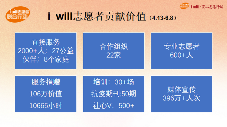 接下来,i will安心行动项目经理李静进行了行动成果总结汇报。她首先向大家追溯了i will志愿者联合行动3年以来的进程,阐释了行动机制和i will中台,详细介绍了安心行动目标、路径、组织架构、运营方式和行动过程等基本情况。在近两个月的时间里,i will安心行动与22家公益组织合作,在阵地开发、志愿者管理、培训赋能、宣传推广、社群服务、平台建设、运营管理等方面均取得了较为明显的成果,扩大了志愿服务社会影响力,创造了一定的社会价值。
