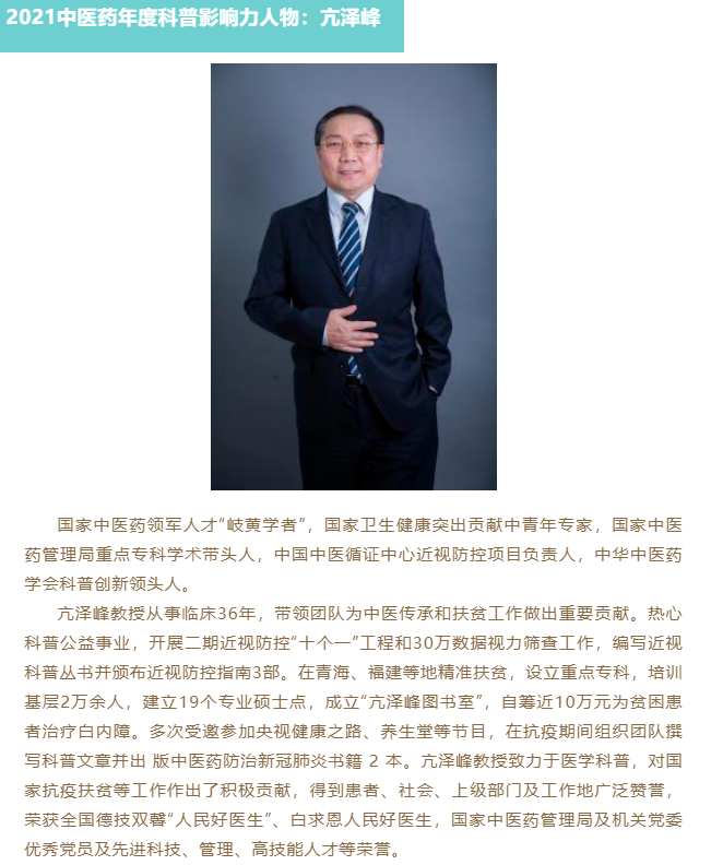 6月18日,在中华中医药学会主办的“2022中国中医药健康科普文化传播大会”上,中国中医科学院眼科医院副院长亢泽峰教授(健康人才榜人物)被评选为2021年度科普影响力人物。