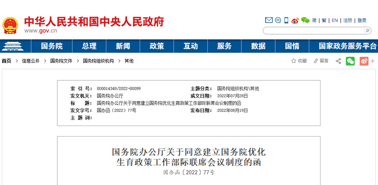 据中国政府网消息,8月19日,国务院办公厅关于同意建立国务院优化生育政策工作部际联席会议制度的函发布。
