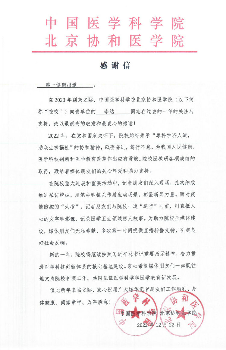 日前,第一健康报道接获来自中国医学科学院、北京协和医学院发来的感谢信。