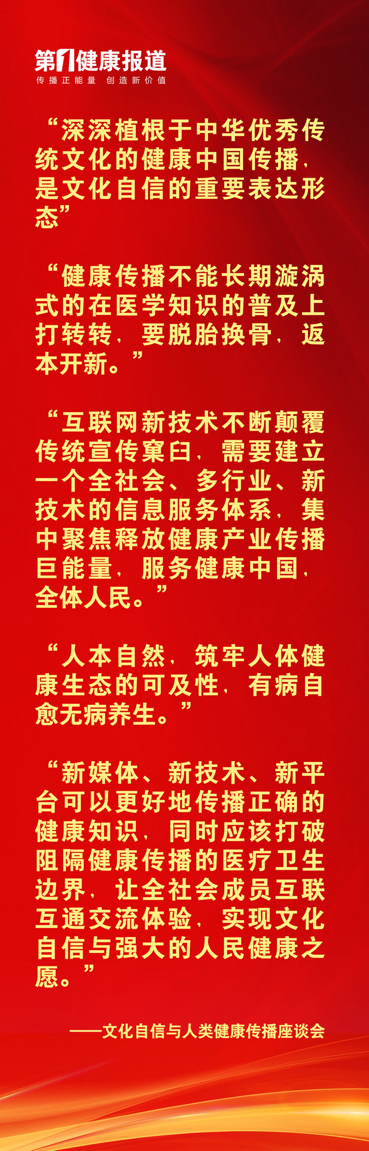 他说,2023癸卯开春之际,按照党的二十大擘画的“为实现中国式现代化人民健康事业”宏大体系建设进程,推动并促进健康中国大健康产业生产力蓬勃发展,由国务院医改领导小组(办公室/秘书处)表彰媒体-第一健康报道召集组织并举办“文化自信与人类健康传播座谈会”,其目的就是落实好《“十四五”国民健康规划》和《健康中国2030战略规划》提出的“构建全媒体健康科普知识发布和传播机制”,为迎接疫情后健康消费“新高潮”,促进大健康产业释放产能,倾注媒体传播力。