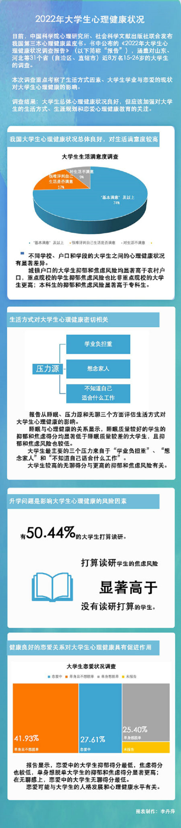 日前,中国科学院心理研究所、社会科学文献出版社联合发布我国第三本心理健康蓝皮书。书中公布的《2022年大学生心理健康状况调查报告》(以下简称“报告”),涵盖对山东、河北等31个省(自治区、直辖市)近8万名15-26岁的大学生的调查。