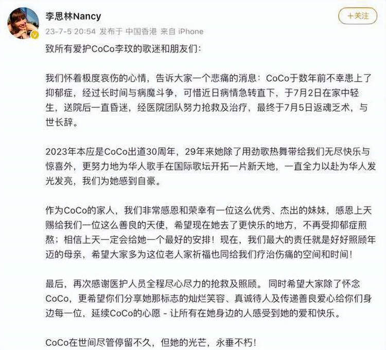 7月5日晚,歌手李玟的家人宣布,李玟于7月2日在家里轻生,送医后一直昏迷,最终于5日离世。