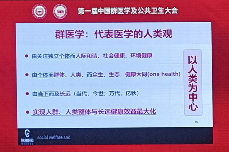 第一健康报道消息,7月16日中国工程院院士王辰在首届中国群医学及公共卫生大会上以《群医学及其意义》为题作主旨报告,阐述了现代医学之变、之方向、之发展,而群医学是医学的新概念、观念、领域、学科,是为恢复、维护、增强人群及至人类、众生、生态的整体与长远健康而发展出的知识、技术、艺术、学术体系,旨在促进群体、人类健康效益最大化、长远化,体现了医学的人类观。
