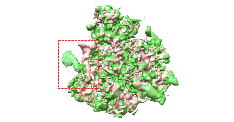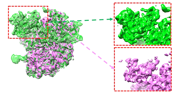 OPUS-DSD重构结构模型与传统冷冻电镜软件解析的模型对比:在虚线标示的区域中,OPUS-DSD重构的模型(绿色)比传统冷冻电镜软件解析的模型(紫红色)有更完整的电子密度。这是因为OPUS-DSD能分开重构不同三维构象,而不会将其重叠在同一个三维模型中