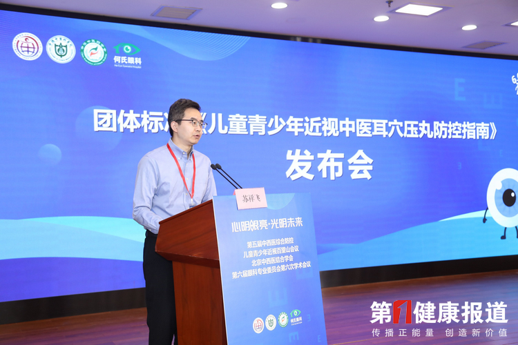 中华中医药学会标准化办公室主任苏祥飞在会上介绍了《儿童青少年近视中医耳穴压丸防控指南》编制过程,并宣读发布公告。