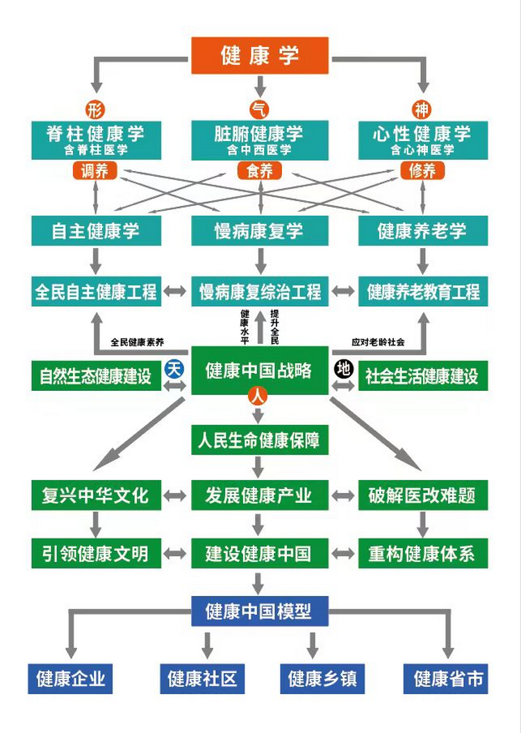 对于健康学,百川健康科学研究院依据人的形、气、神三个维度分别创立脊柱健康学、脏腑健康学和心性健康学三门基础理论学科,而从应用层面,又设立了自主健康学、慢病康复学和健康养老学三大门类(如下图)。