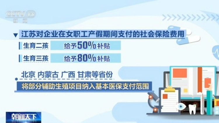 江苏:对企业在女职工产假期间支付的社会保险费用,生育二孩、三孩的分别给予50%、80%的补贴。