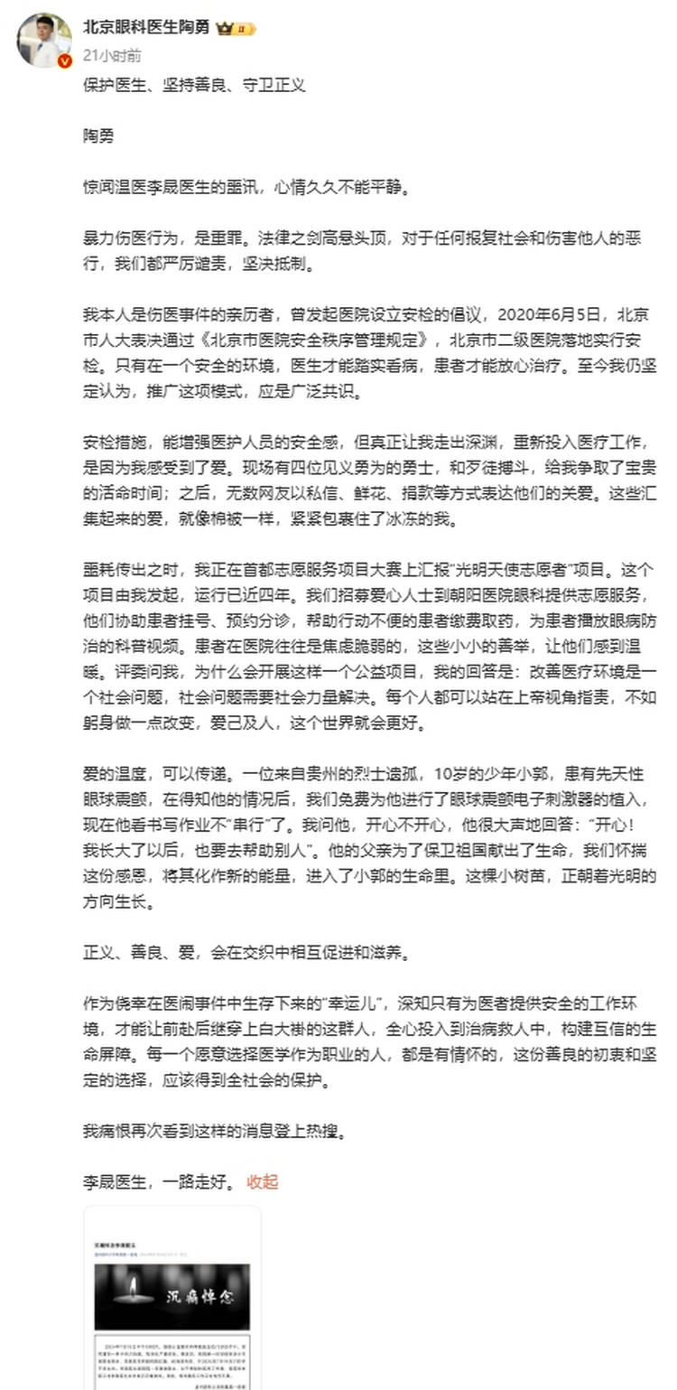7月20日,曾在2020年遇袭的北京朝阳医院眼科主任医师陶勇在微博上悼念因遭持刀伤害不治身亡的李晟医生,并谴责暴力伤医的行为。