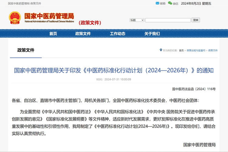 7月31日,国家中医药管理局发布《中医药标准化行动计划(2024-2026年)》(以下简称《行动计划》)。
