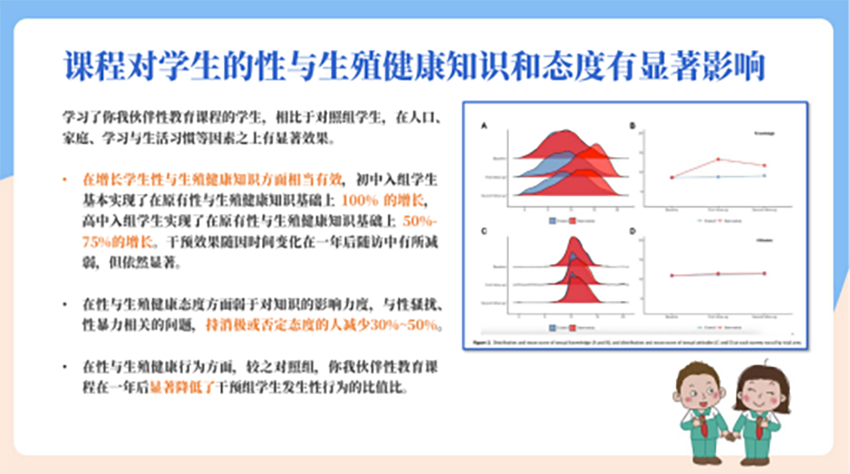 谈到丛书教学实践效果,张耀华分享了项目与清华大学公共健康研究中心的合作成果。丛书课程作为干预方法的研究在甘肃省进行了预试验,并在广东和云南省进行了正式试验。研究表明,课程对学生的性与生殖健康知识和态度有显著影响:在增长学生性与生殖健康知识方面相当有效,初中入组学生基本实现了在原有性与生殖健康知识基础上100%的增长,高中入组学生实现了50%-75%的增长;在性与生殖健康态度方面,与性骚扰、性暴力有关的问题,持消极或否定态度的人减少了30%-50%;在性与生殖健康行为方面,课程在一年后显著降低了干预组学生发生性行为的比值比。