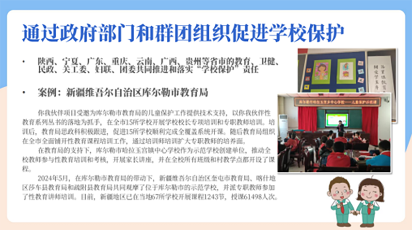 他说,“你我伙伴”性教育公益项目是专门为6-18岁儿童青少年设计的优质性教育项目,项目使命和愿景在于促进每个儿童青少年都能享有优质性教育,促进每个儿童青少年都能做出对自己和他人健康、安全和幸福负责任的积极选择。作为儿童青少年性教育领域社会影响力最大的公益项目之一,项目广泛动员全国各地的政府部门、群团组织和社会组织,建立多方合作、共同推广的机制, 服务范围涉及省级行政区域29个、市县581个;课程服务覆盖中小学超过3700所;动员和培养性教育讲师累计超过15000名;受益儿童青少年累计超过450万人次。