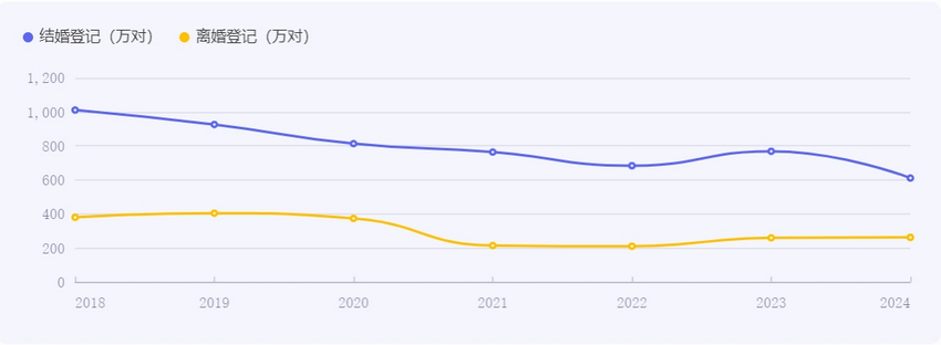 相较于2023年民政统计数据(结婚登记768.0万对,办理离婚登记259.3万对),2024年结婚登记数据比去年减少157.4对,下降约为20.5%,离婚登记增加2.8万对,上升了约1.1%。