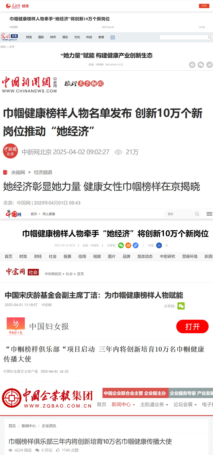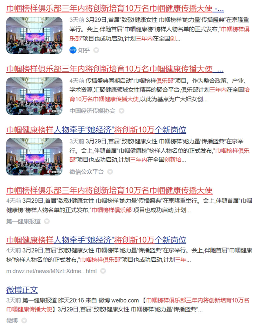 媒体报道共同关注到本次活动中“健康中国”与“她经济”共振的鲜活主题。多家媒体在报道中重点关注到在传播盛典上正式启动的“巾帼榜样俱乐部”项目,该项目计划三年内在全国培育10万名巾帼健康传播大使,以此为基点为广大妇女创造健康领域新型就业岗位10万个,构建专业化健康传播队伍。