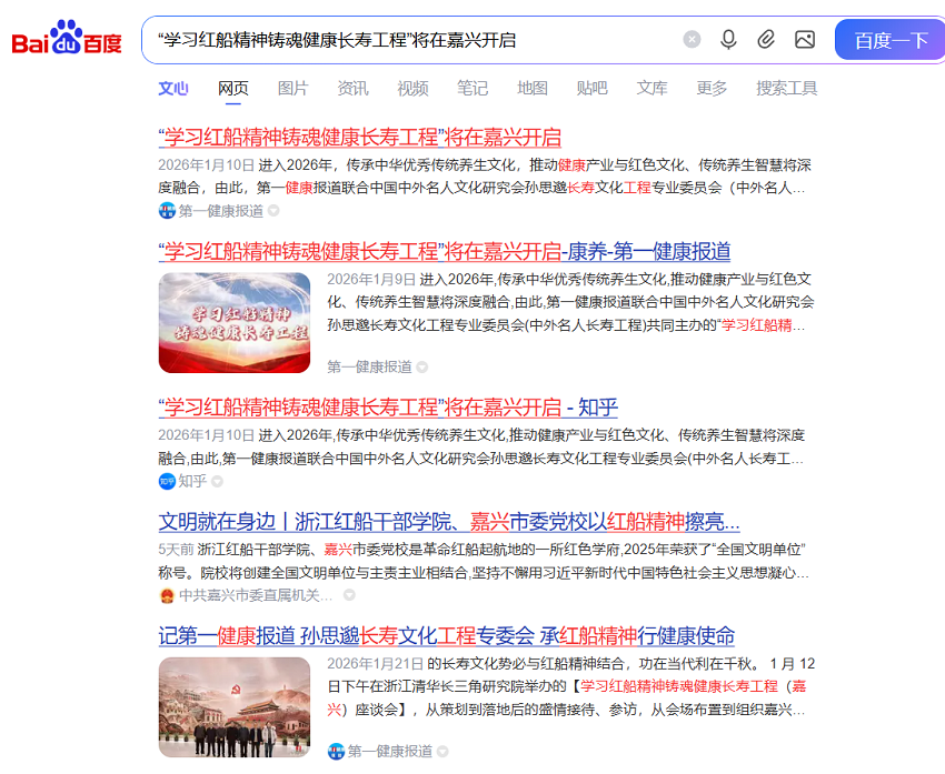 1 月 11 日-13 日,由中国中外名人文化研究会孙思邈长寿文化工程专业委员会与第一健康报道联合组织发起的“健康长寿工程万里行”首站活动,得到嘉兴各界朋友们的大力帮助和支持,从 11 日下午到达嘉兴南站开始,在嘉兴大学杨明泉教 授的精心安排和杨晓松古法中医师的全程陪同下顺利开展,至 13 日上午,完成瞻仰中共一大代表风貌,学习红船精神,重温新中国百年奋斗史的夙愿;实现与嘉兴红船文创,清华长三 角研究院中医科技,嘉兴绿色农业以及大健康各界企业家直接沟通座谈、参访调研的既定目标;13 日中午,专委会、第一 健康报道一行 6 人与特邀嘉宾王国昌教授,赶赴上海参观中共一大会址及其纪念馆。期间,每个人都亲身体验亲自感受了105 年前那段波澜壮阔的近代中国奋斗者们为国家为民族争取独立,改变孱弱,战胜困难,勇于拼搏,矢志不渝,打下江山,最终奠定了民族自强自立的强大精神力量,每个人的精神状态和身体状况受此感染达到极度兴奋,无比欢畅。短短三日出行活动,为 2026 专委会全年工作布局奠定了良好基础,活动取得圆满成功。