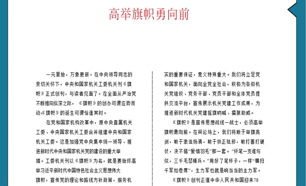 在党和国家机构改革中,原中央直属机关工委、中央国家机关工委合并组建中央和国家机关工委。这是加强党中央集中统一领导、推进新时代中央和国家机关党的建设的重大举措。工委机关刊以《旗帜》为名,就是要始终高举习近平新时代中国特色社会主义思想伟大旗帜,宣传党的理论和路线方针政策,服务机关党的建设,弘扬主旋律、传播正能量,努力成为推动机关广大党员干部学习成长的旗帜、促进机关党建理论探索和实践创新的旗帜、引领社会思潮和舆论的旗帜,让党的旗帜在中央和国家机关高高飘扬。