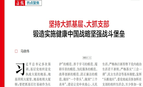 近日,刚刚出版的第三期《旗帜》杂志刊登国家卫生健康委党组 书记、主任马晓伟署名文章,原标题为“坚持大抓基层、大抓支部锻造实施健康中国战略坚强战斗堡垒”,旗帜杂志社授权第一健康报道转发。