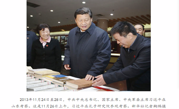 2013年11月26日,习近平来到曲阜孔府考察。在同有关专家学者代表座谈时,习近平表示研究孔子和儒家思想要坚持历史唯物主义立场,坚持古为今用,去粗取精,去伪存真,因势利导,深化研究,“使其在新的时代条件下发挥积极作用”。
