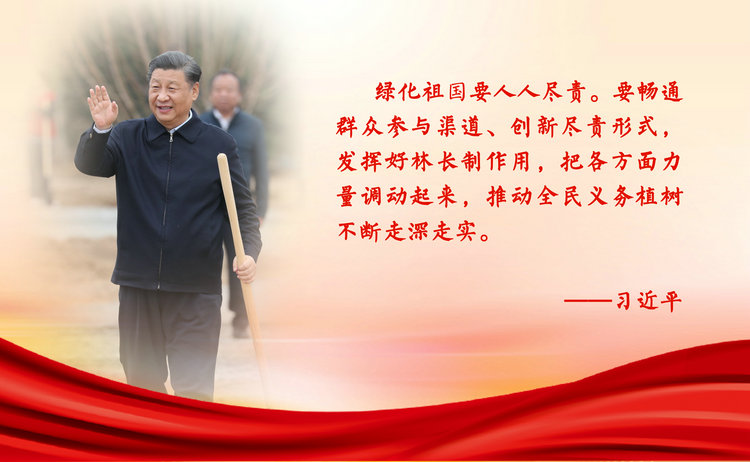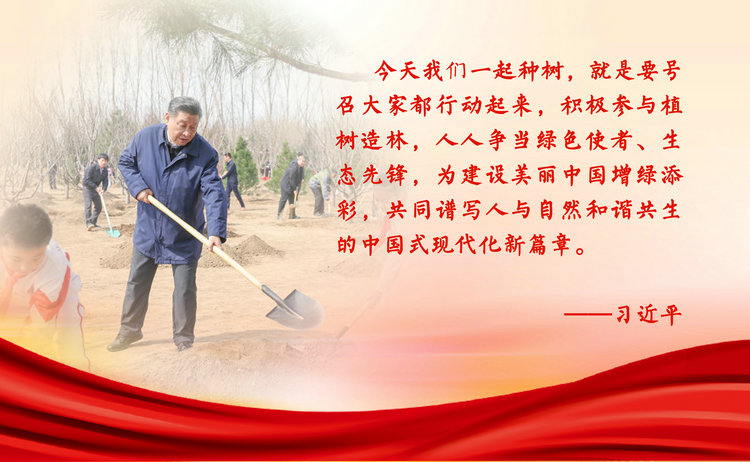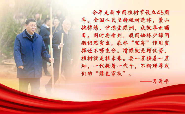据新华社消息,中共中央总书记、国家主席、中央军委主席习近平3日上午在参加首都义务植树活动时强调:人人争当绿色使者、生态先锋,为建设美丽中国增绿添彩,共同谱写人与自然和谐共生的中国式现代化新篇章;今年是新中国植树节设立45周年。全国人民坚持植树造林,荒山披锦绣,沙漠变绿洲,成就举世瞩目。