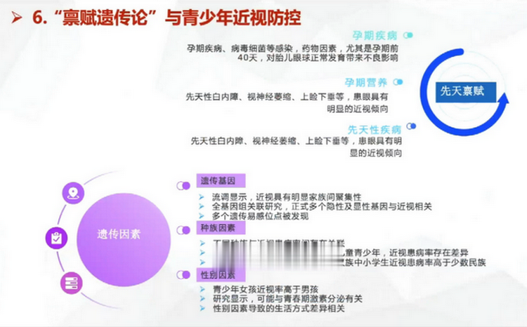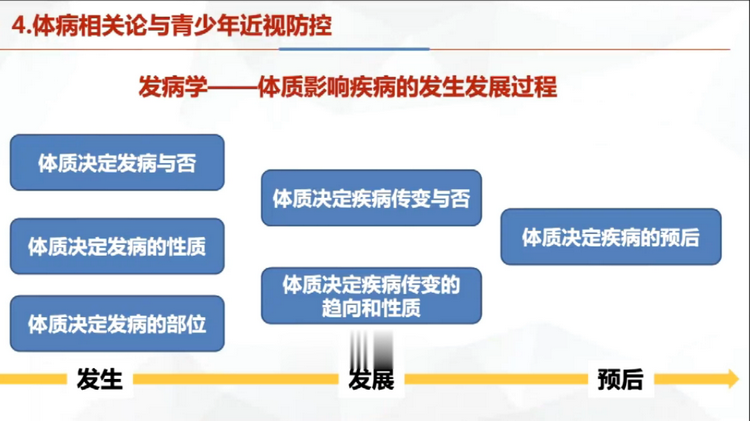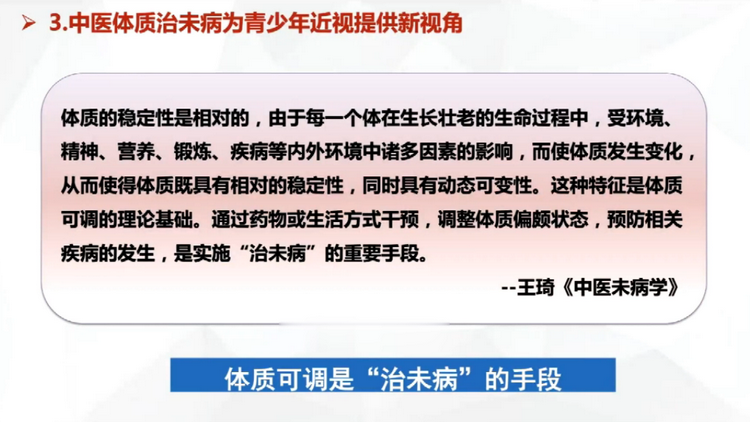 “禀赋遗传论”就是讲遗传的问题,大家注意到孕期阶段的时候已经带来眼球发育的问题了。先天性疾病里面就有很多的东西,遗传基因、种族基因、性别基因,那些都是遗传因素。这些问题就需要我们知晓,不要一遇到这个问题的时候就说不可逆。我们可逆的地方是在哪里、不可逆的地方是在哪里。要把它从科学问题上分析清楚,防治青少年的近视,我们刚才说胎儿期间的时候具有这种危险因素,我们没做过这事。我们对于预防青少年近视的发生,以及控制青少年的发生,我们研究了体质以后,体病相关。刚才你们看到了,不同气虚的人、阳虚的人,不同体质类型的人他的发病是不一样的,发现疾病高危人群,我们来关口前移,对这些孩子们加以更大的关注。
