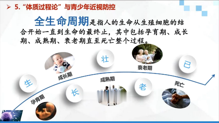 生命全周期青少年近视,从“生-长-壮-老-已”的过程。《黄帝内经》里讲了10岁、30岁、50岁、70岁、90岁的过程。这里讲的是《上古天真论》的生命过程。在这个过程中就说明了一个问题,体质是以时相来展开的,也就是说你的幼年、青年、壮年、老年,这个生命的段,这个生命的段是你的不同时期的生命,在这个时空的过程中你慢慢展开。而在这个展开的过程中,他的发育跟他的生命过程构成了不同的图景。