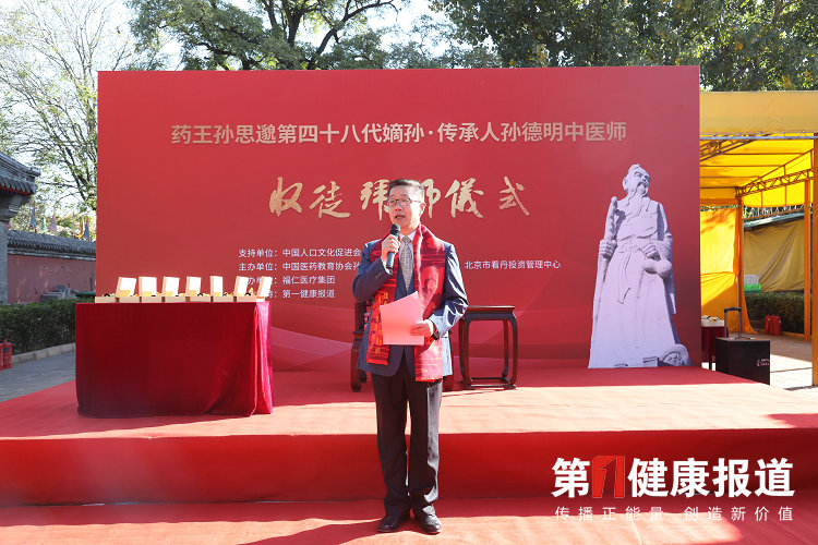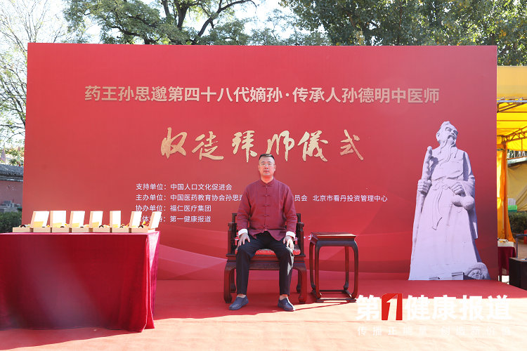 10月22日,在北京看丹药王文化传承基地举办的孙思邈长寿论坛暨第二届健康老人功勋传播盛典活动中,一场传承孙思邈大医精诚思想的传统方式收徒拜师仪式得到了众多专家学者的见证与习礼,开启了药王孙思邈第48代传承人孙德明医师的收徒授业之路。