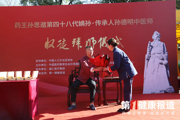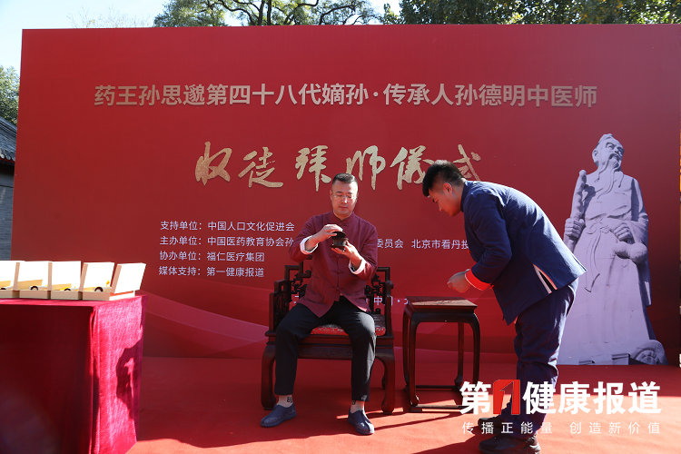 收徒拜师仪式现场气氛热烈而庄重,孙思邈第48代孙孙德明医师身着红色唐装,坐在主席台正中,接受亲传弟子们拜师礼数。